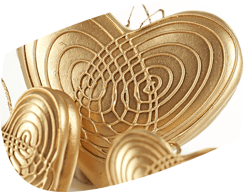 Our energy hearts are made using a special honey dough that, if kept in a dry place, can last over 50 years. Creating the wave-like latticework is a complex and time-consuming task, requiring maximum concentration and an artistic streak. When an energy heart is decorated, gold leaf is applied by hand using a special technique, making the product all the more exclusive. This research-based modern design is the creative work of the designer Oskar Kogoj.